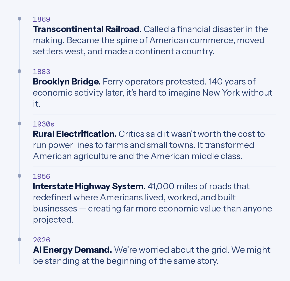 The pattern is always the same: a big new demand arrives. It seems expensive, risky, maybe reckless. Skeptics focus on the cost. And then the infrastructure built to meet that demand becomes the foundation for the next hundred years of growth.